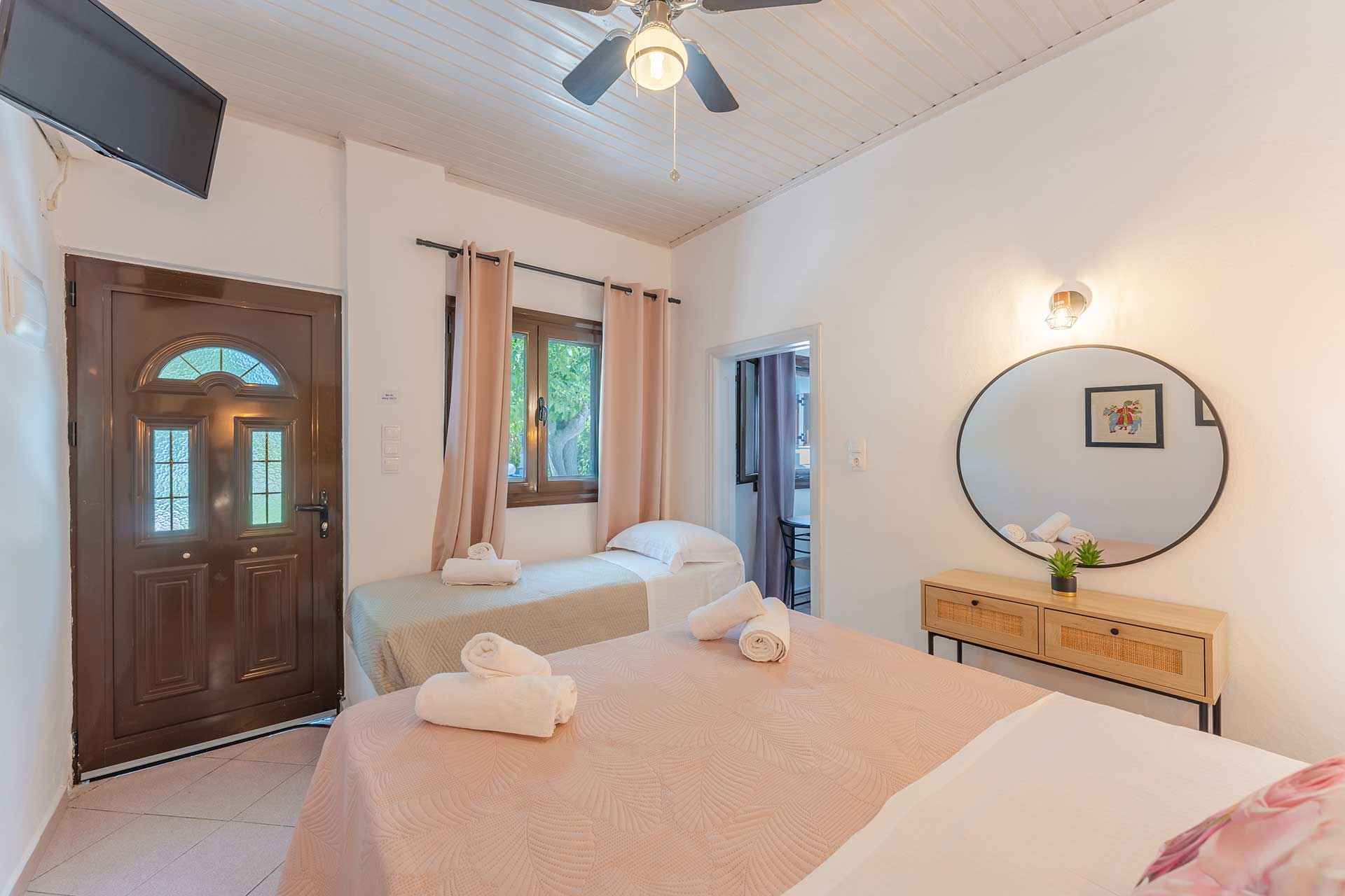 Δ ωμάτιο 30μ2 με θέα τη χώρα της Σκύρου, ιδανικό να φιλοξενήσει εως 3 άτομα. Προσφέρει ιδιωτικό μπαλκόνι με θέα στους περιποιημένους κήπους και διαθέτει ξεχωριστό υπνοδωμάτιο και μικρή κουζίνα. Περιλαμβάνει επίσης δωρεάν Wi-Fi και τηλεόραση.